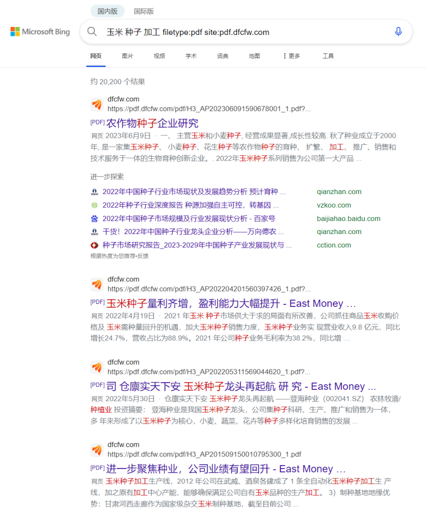 如输入:”玉米 种子 加工 filetype:pdf site:pdf.dfcfw.com“