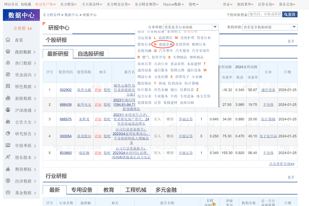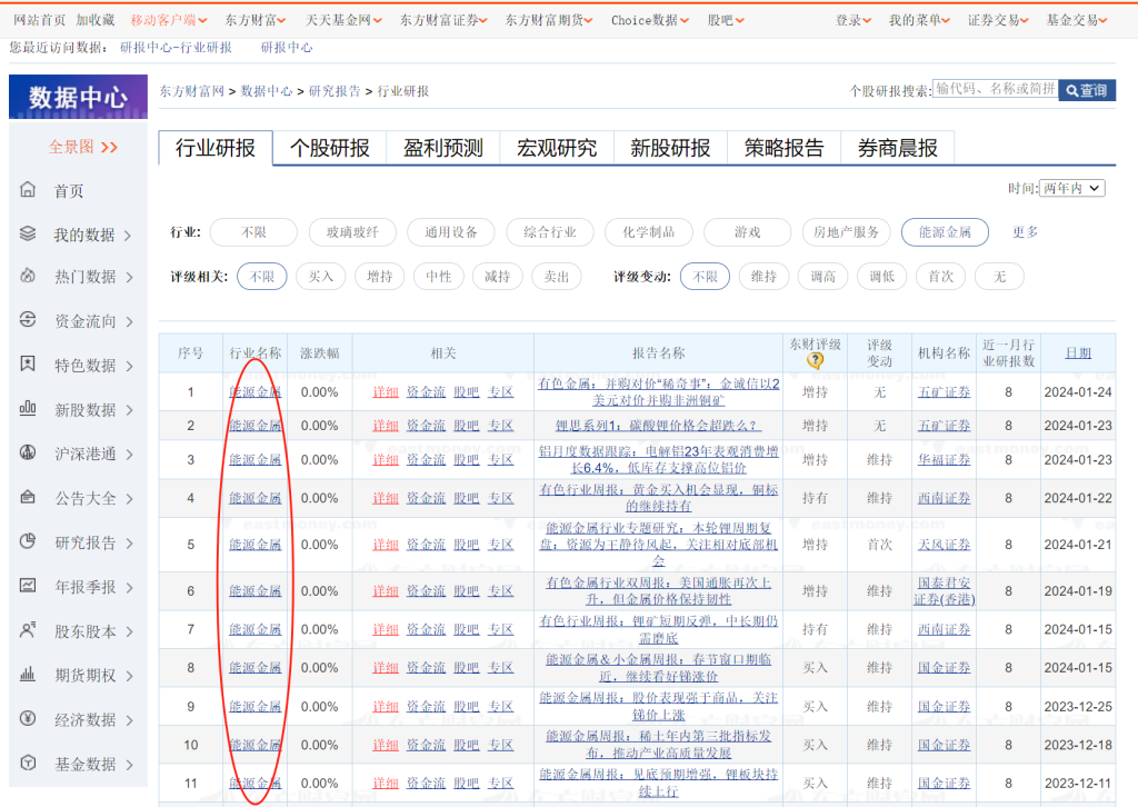 选择能源金属,进入相关研报筛选页面https://data.eastmoney.com/report/industry.jshtml?hyid=1015