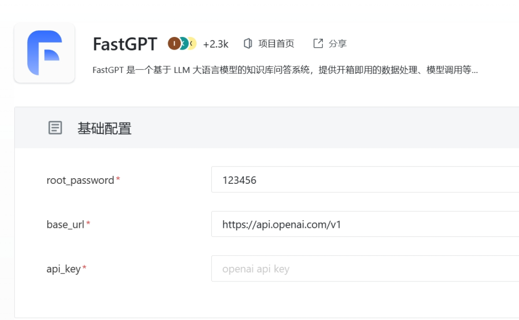 5 默认用户名为root,需设置密码,并填写OpenAI的api_key。点击右上角进行部署。