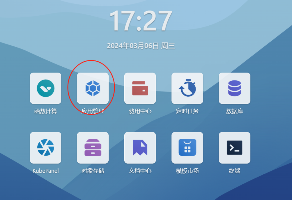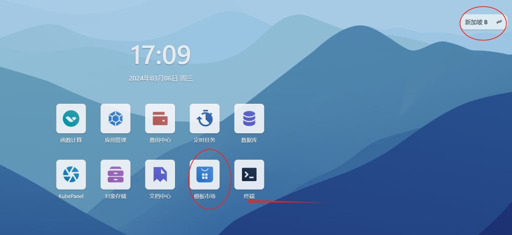 3 点击应用市场(右上角为服务器所在区域,按默认新加坡即可)