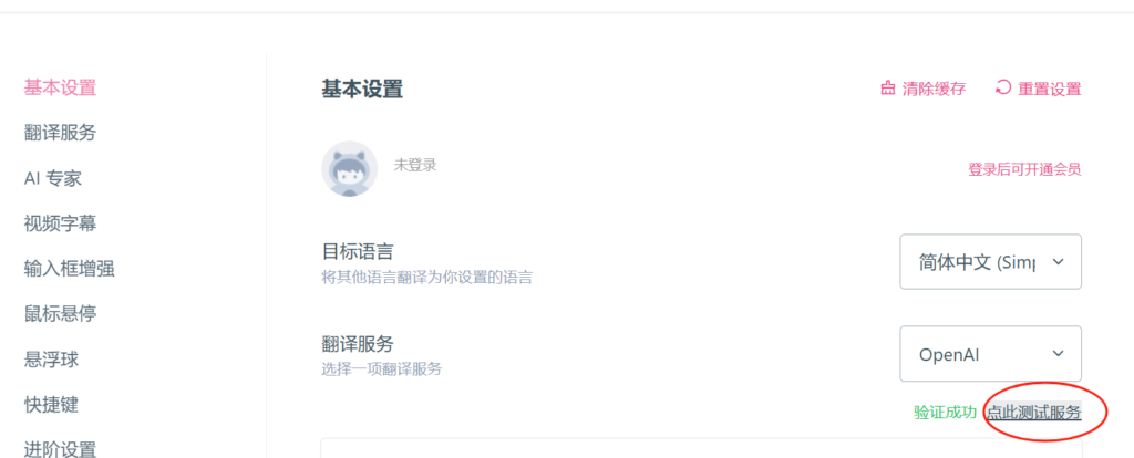 5 回到顶端,点击“点此测试服务”,如出现绿色的验证成功,则可以打开英语网页进行翻译。