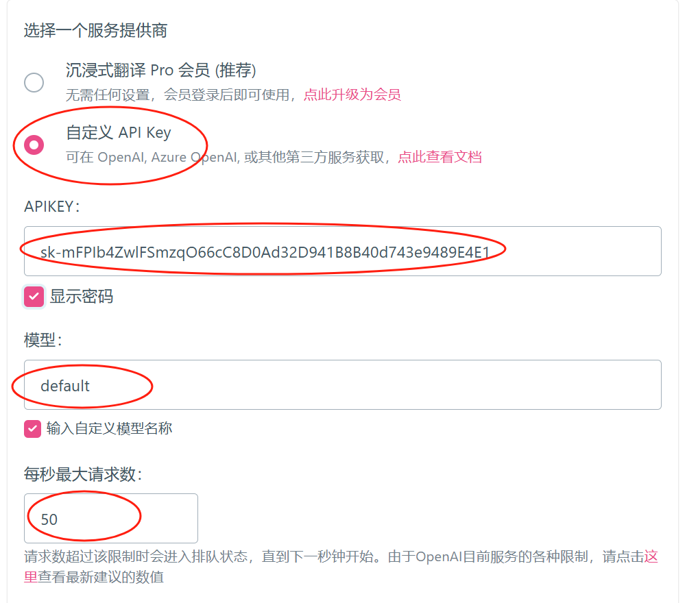 实现原理:通过OneAPI开源项目,将智谱的API转换为openai的api格式填入沉浸式翻译配置中。